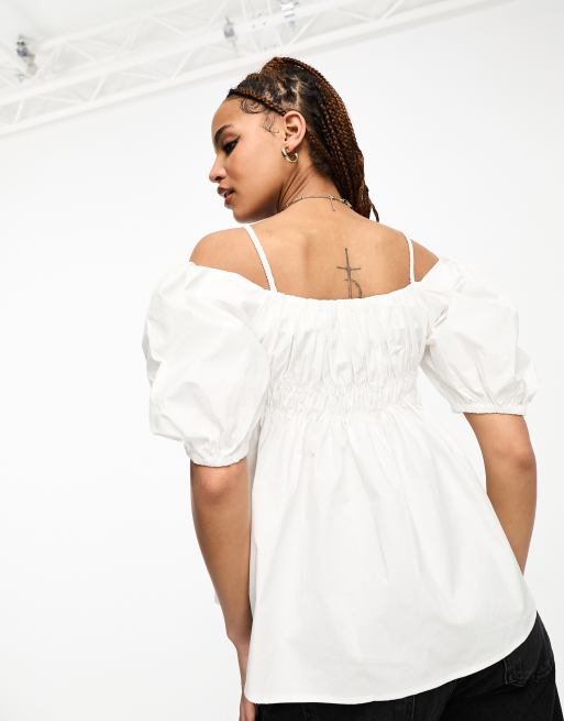 Blusa blanca con escote Bardot y mangas abullonadas de Urban