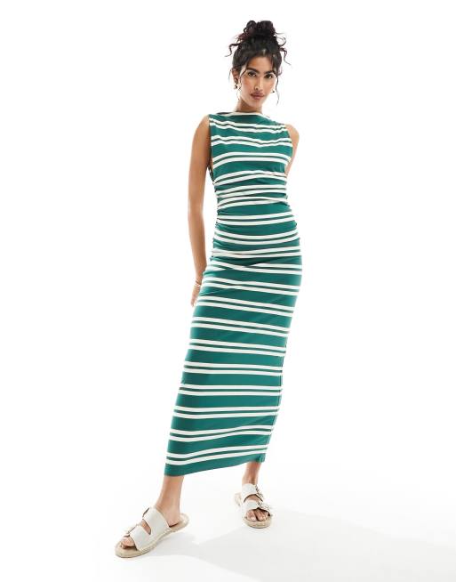 Vestido midi verde a rayas blancas con cuello barco y laterales fruncidos de ASOS DESIGN