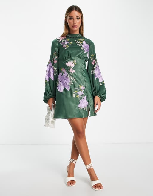 Vestido corto verde con bordados art sticos de flores de sat n de ASOS DESIGN