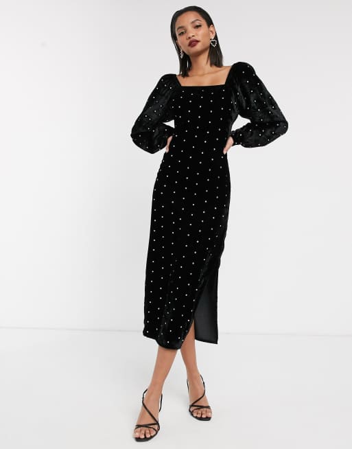 Vestido largo de terciopelo con manga abullonada y strass de ASOS DESIGN