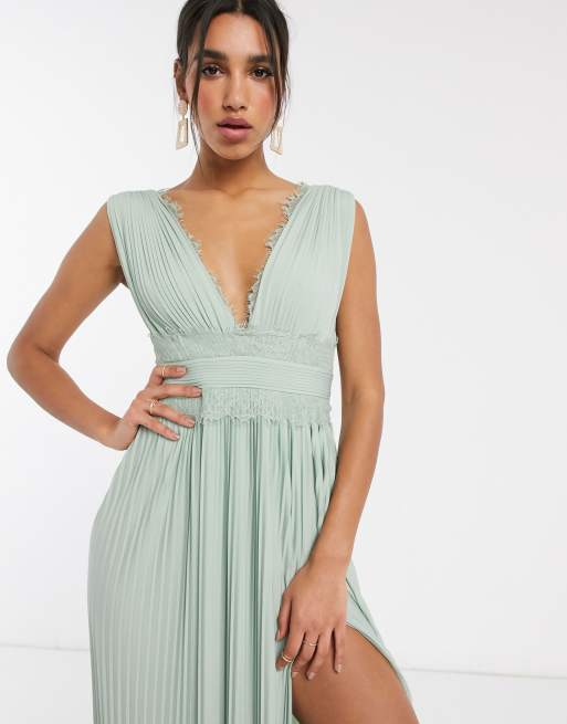 Asos vestidos outlet boda largos, Vestido largo verde salvia con dise o plisado y aplicaci n de encaje premium de ASOS DESIGN outlet
