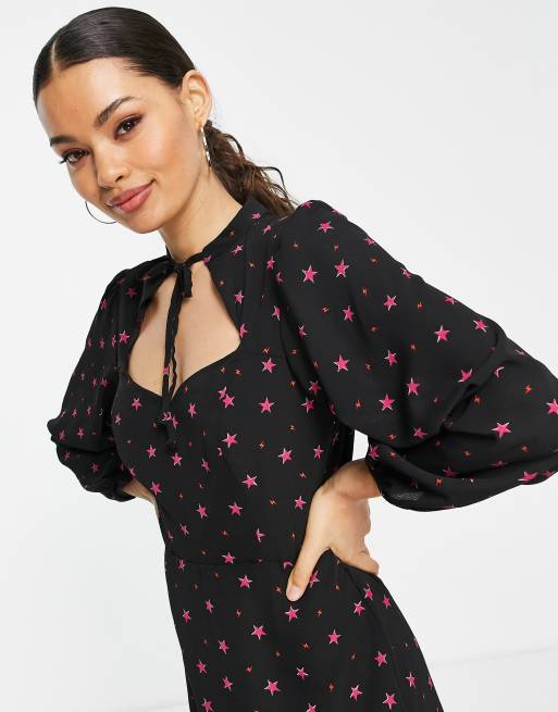 Vestido negro con abertura estampado de estrellas rosas y detalle de lazada en el cuello de New Look Petite