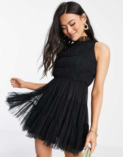 Vestido negro con espalda de encaje y falda campana plato Dress