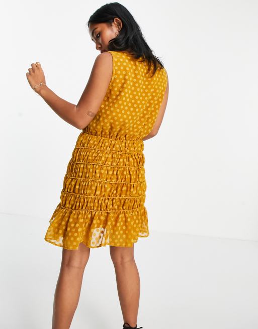 Vestido corto amarillo mostaza sin mangas con falda fruncida y