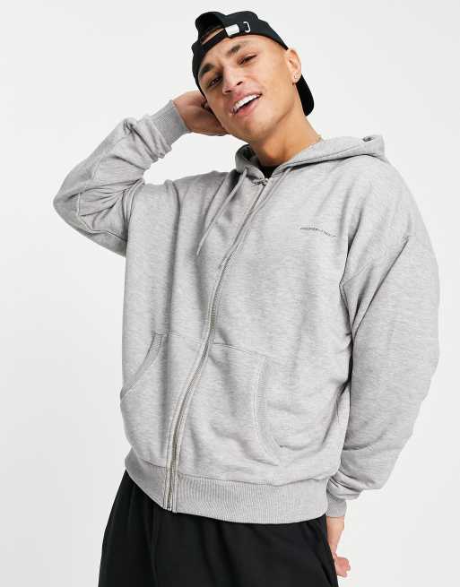 Sudadera gris con capucha cremallera y logo estampado en el pecho