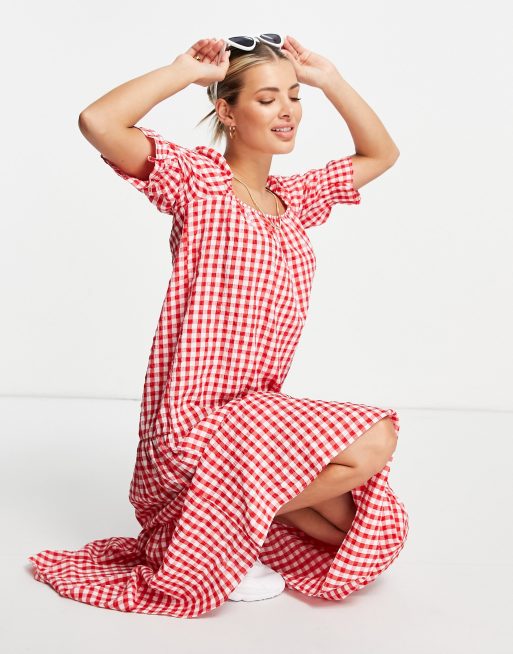 Vestido largo a cuadros vichy rojos de corte amplio escalonado de ASOS DESIGN