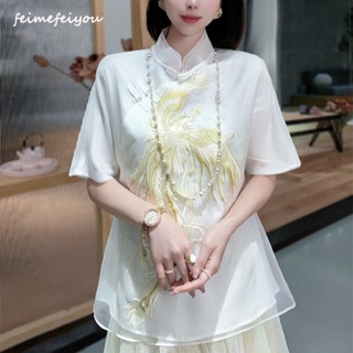 Blusa de seda aut ntica de estilo chino para mujer camisa de manga corta con cuello levantado estampado Natural 2023