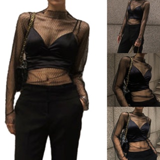 Polera transparente outlet negra mujer, Malla Brillos Manga larga Moda Mujer outlet