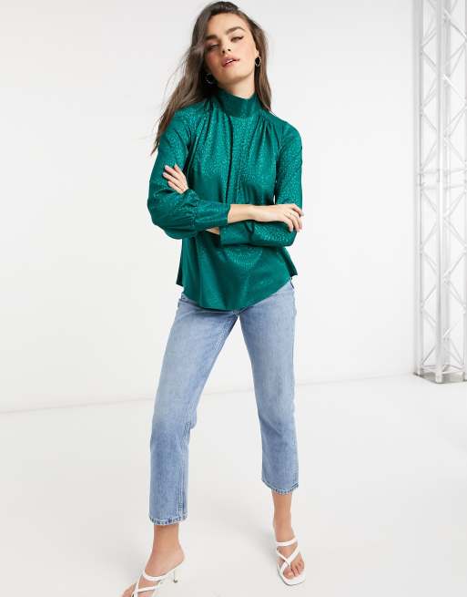 Blusa verde esmeralda de jacquard con cuello subido de Closet