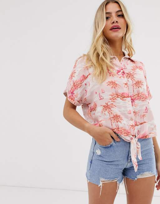 Camisa outlet nudo delantero, Camisa con nudo delantero y estampado tropical rosa de New Look outlet