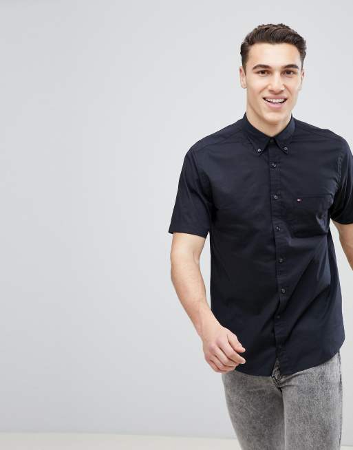 Tommy Hilfiger Short Sleeve Stretch Poplin Button Down Shirt Flag Logo Regular Fit in Black