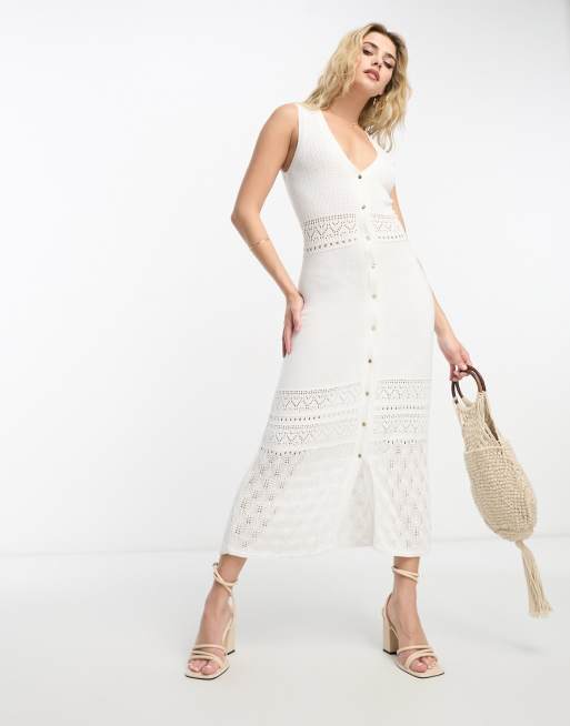 Vestido largo blanco con cuello de pico y detalles calados de punto de Morgan