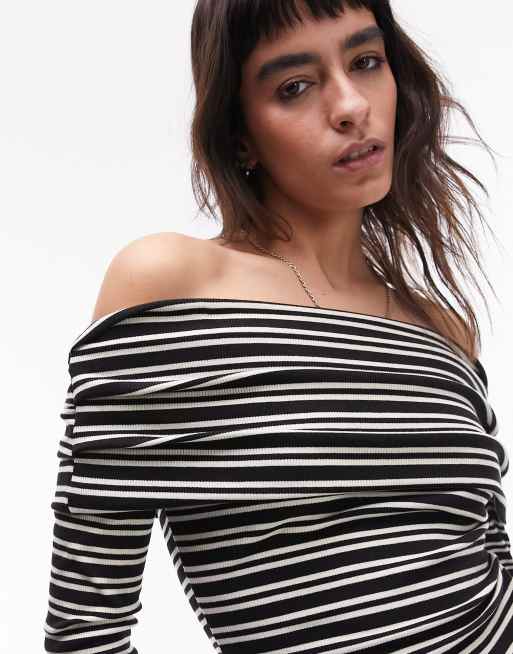 Camiseta monocrom tica a rayas con escote Bardot de manga larga de Topshop