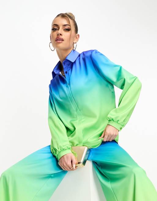 Conjunto verde y azul degradado de camisa y pantalones de sat n de