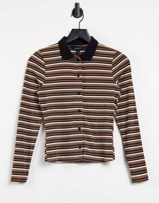 Camiseta abotonada outlet, Camiseta abotonada marr n a rayas con detalle en el cuello de New outlet