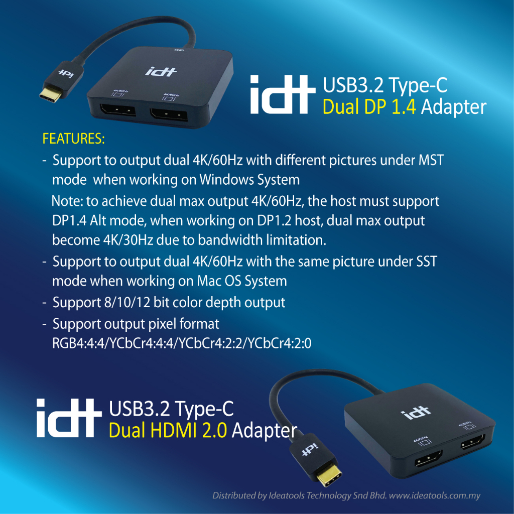 IDT Type C to 2 DP 1.4 HDMI 2.0 ports Adapter USB C to Dual DP1