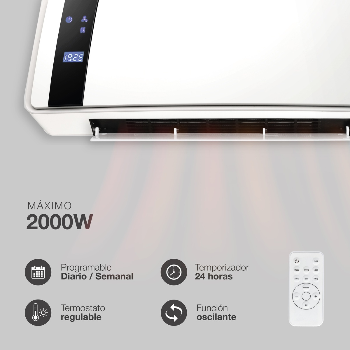 MT Calefactor electrico de pared mini. mando a distancia. 2 potencias 1.000 2.000 w. funcion solo ventilador. 51 5x38x41 cms