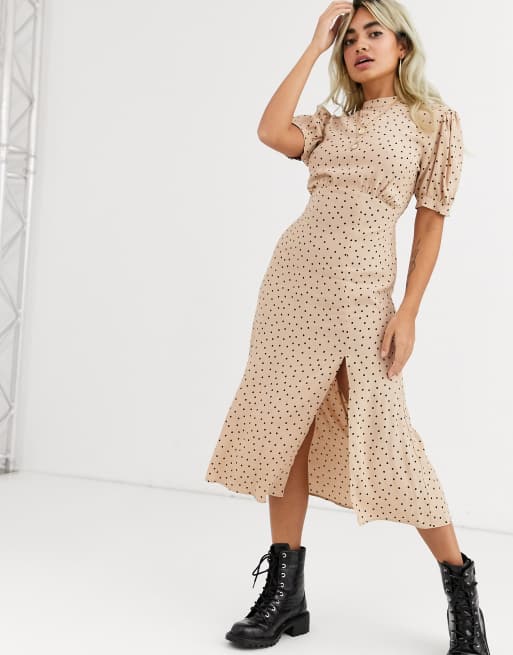 Midi jurk beige lange mouwen met ceintuur en split Esuals