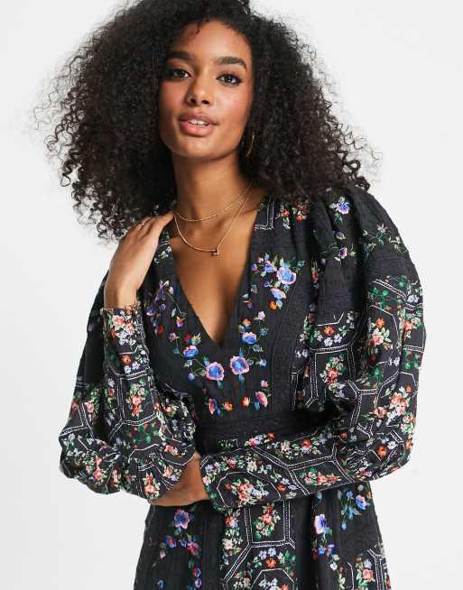 Jurk zwart outlet met bloemen, ASOS EDITION Midi jurk met geborduurde bloemen en kanten outlet