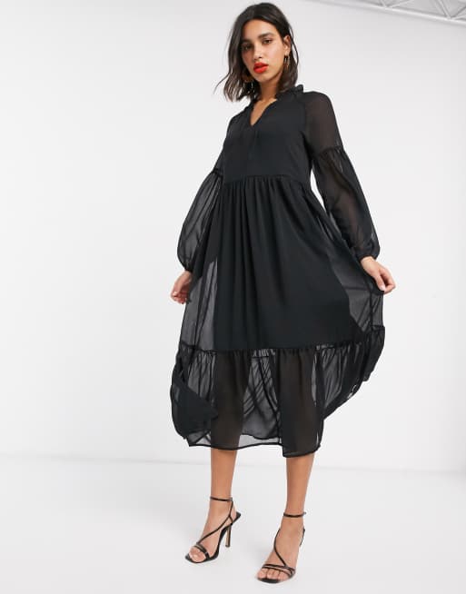 Chiffon outlet jurk lang, Vila Lange chiffon jurk met ruchehals in zwart outlet