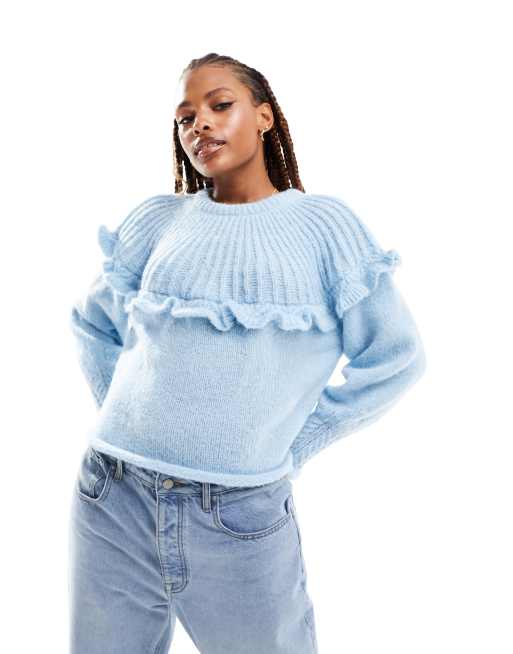 Pieces Gebreide trui met ruches in babyblauw ASOS