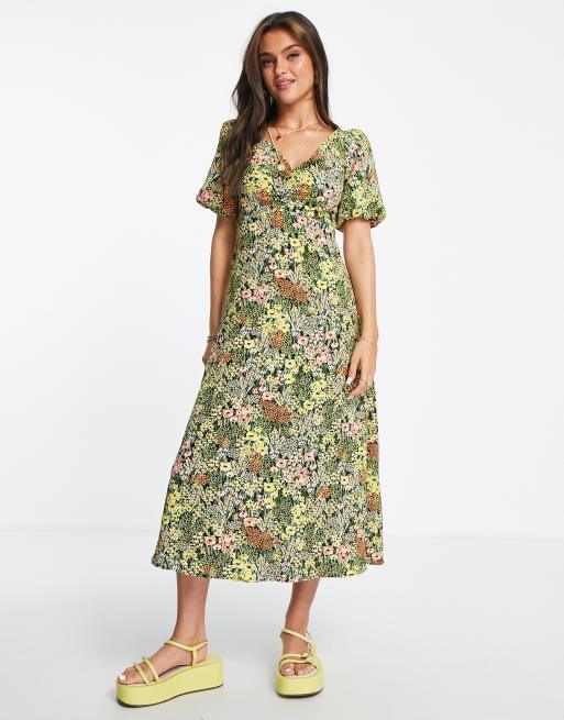 New Look Midi jurk met gestrikte achterkant pofmouwen en fijne bloemenprint in groen