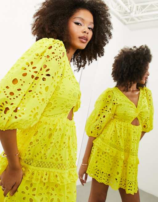Geel jurk outlet, ASOS EDITION Mini jurk met broderie gedraaide voorkant en outlet