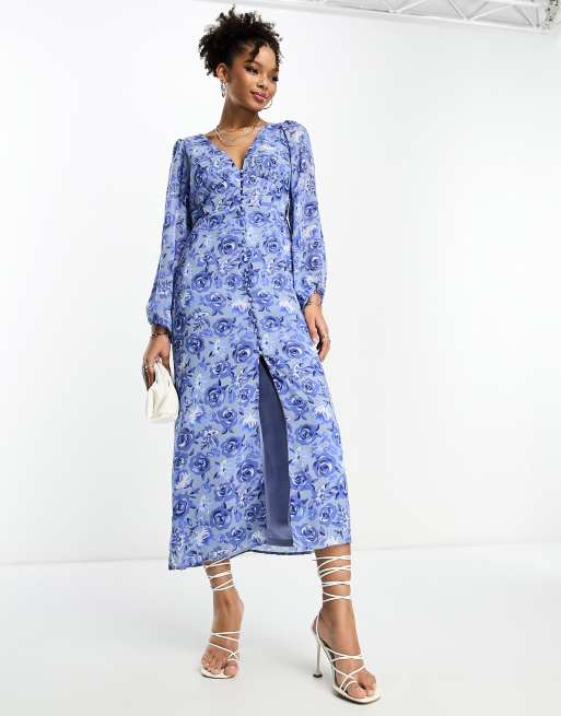 Vila Lange jurk met V hals en knoopsluiting in blauwe