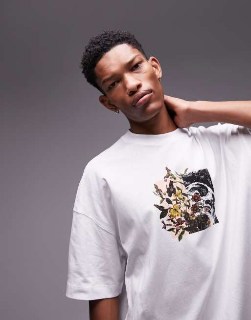 Topman Premium Extreem oversized t shirt met gespleten bloemenprint in wit
