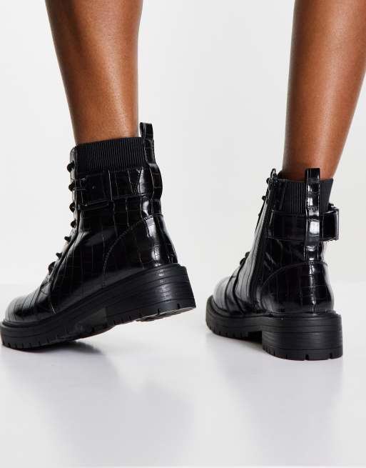 New Look Bottines plates lacets avec boucle effet croco Noir