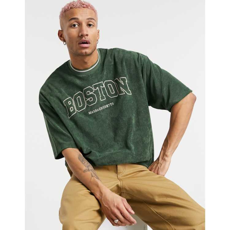 ASOS DESIGN oversized t shirt in khaki towelling with Boston city print