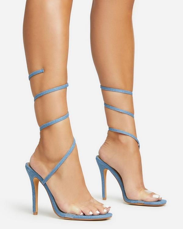 Blue wrap outlet around heels, Ember Wrap Around Clear Perspex Strap Stiletto Heel In Blue Denim outlet