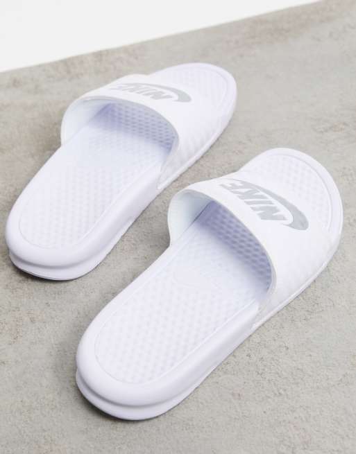 Nike benassi slides outlet white and silver, Nike Benassi sliders in white and silver outlet