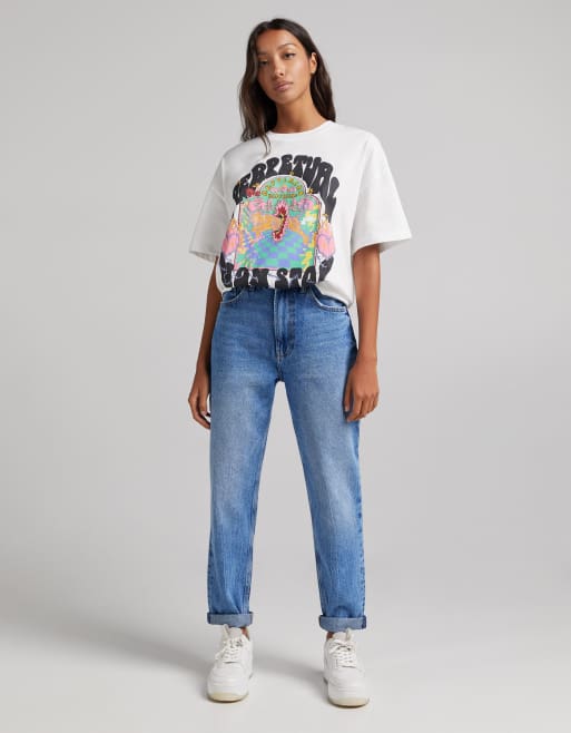 Bershka oversized psychedelic slogan tee in white