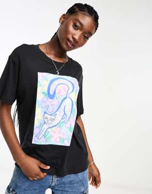 Monki short sleeve cat print t shirt in black