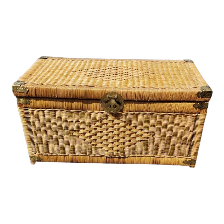 Blanket outlet box rattan, Mid Century Asian Style Brass Mounted Wicker Blanket Chest Storage outlet