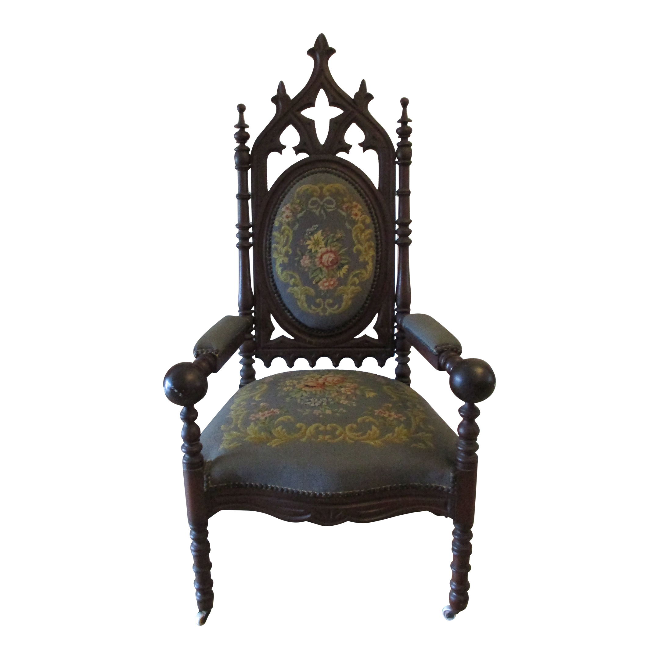 Antique Gothic Revival Mahogany and Needlepoint Ball Arm Throne