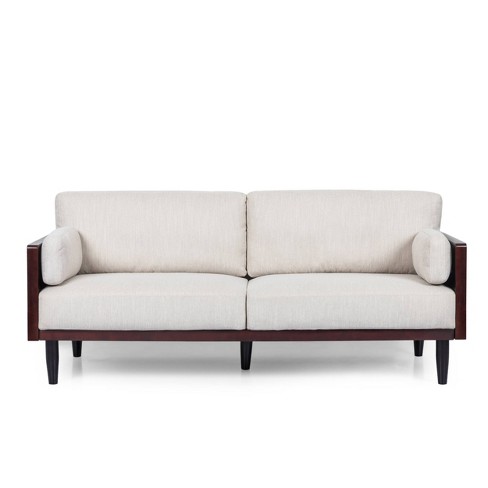 Sofia Mid Century Modern Upholstered 3 Seater Sofa Beige Dark Walnut Christopher Knight Home