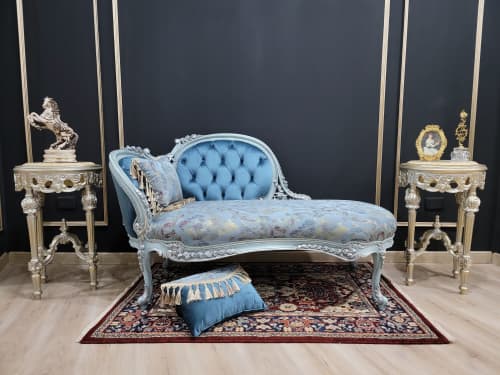 French Style Chaise Lounge Aged Silver Blue Frame Finish by Art