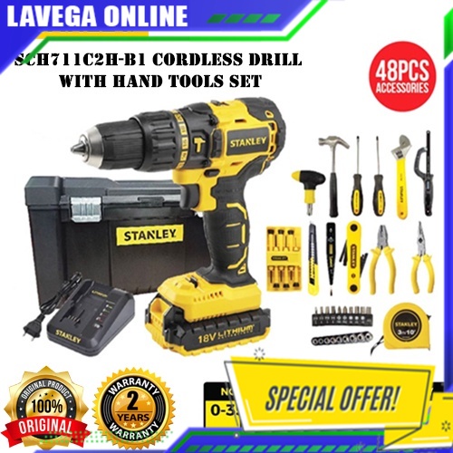 STANLEY 18V 1X1.3AH LI ION 13MM HAMMER DRILL W 48PCS HAND TOOL SET