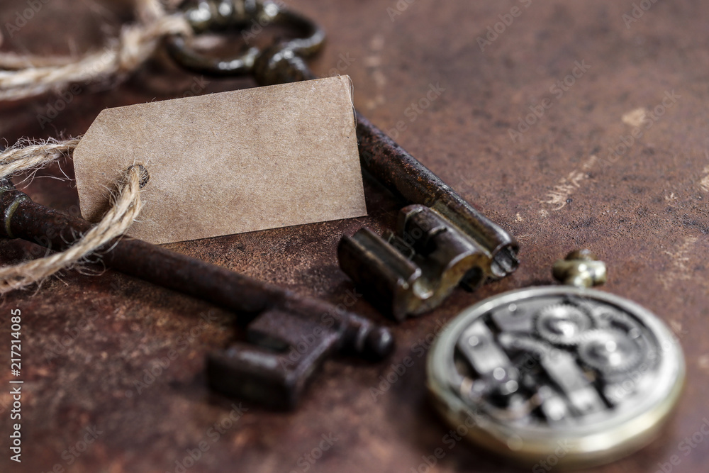 cl anciennes et montre gousset sur fond rouill 1 Stock Photo