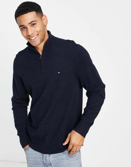 Tommy Hilfiger Pull en maille de laine douce ultra fine logo drapeau et col zipp Bleu marine