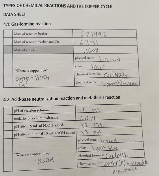 Solved TYPES OF CHEMICAL REACTIONS AND THE COPPER CYCLE DATA