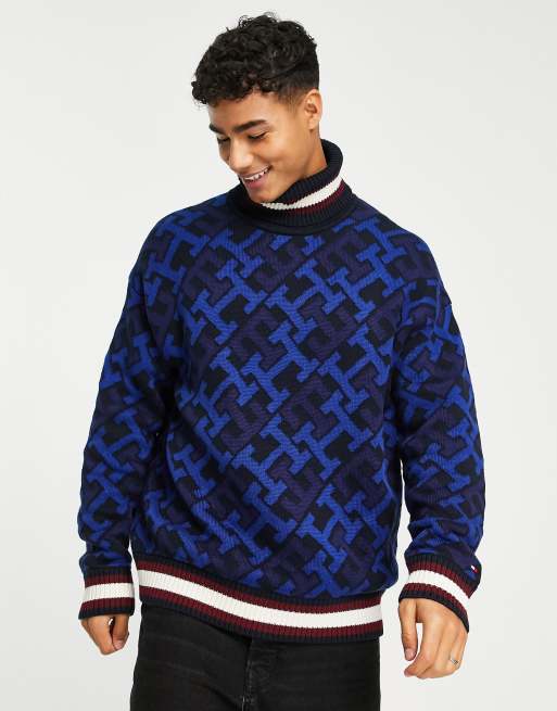 Tommy Hilfiger Pull en maille de coton col roul liser et monogramme Bleu marine