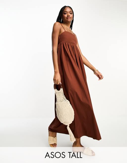 ASOS DESIGN Tall Robe d t babydoll mi longue en coton avec plis sur le buste Chocolat