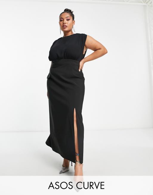 Asos robe outlet mi longue, ASOS DESIGN Curve Robe mi longue fendue sans manches avec poche Noir outlet