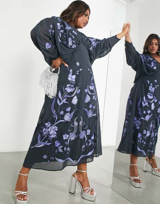 ASOS EDITION Curve Robe mi longue en mousseline fleurs brod es et manches chauve souris Bleu p trole