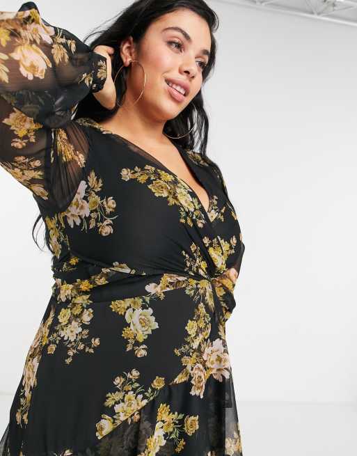 ASOS DESIGN Curve Robe mi longue fleurie crois e la taille avec jupe doubl e et manches longues