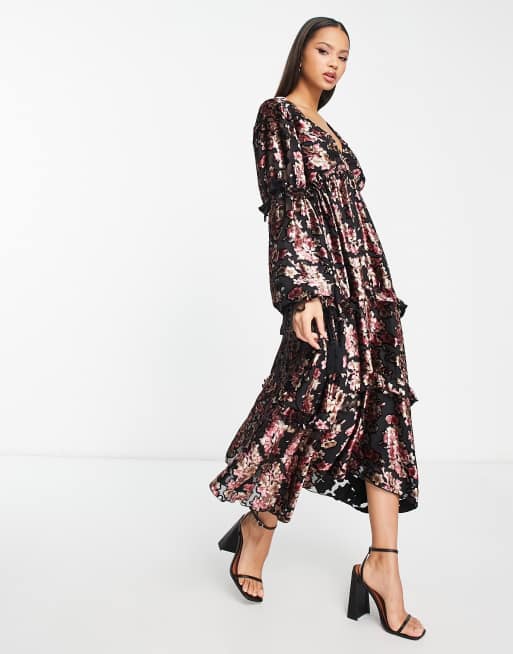 Robe à fleurs outlet manches longues, ASOS DESIGN Robe mi longue en tissu d vor fleurs avec manches longues et bordure en dentelle outlet