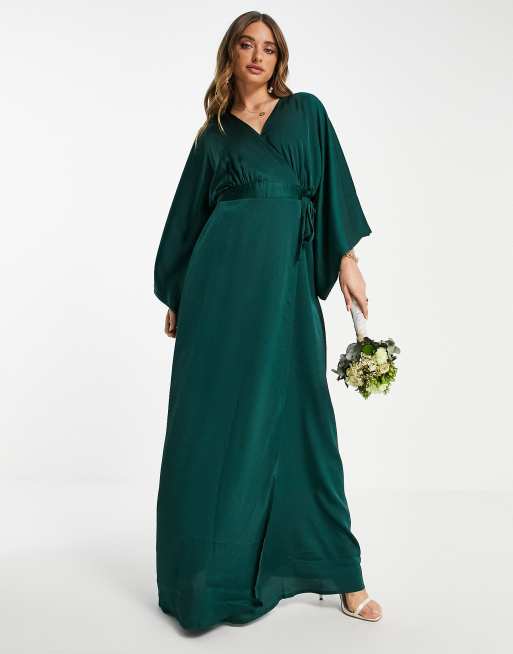 TFNC Robe portefeuille longue de demoiselle d honneur en satin manches kimono Vert meraude